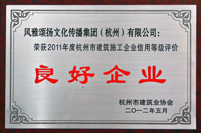 近日,风雅颂扬文化传播集团收到杭州市建筑业协会“杭建协【2012】12号”文件,确认我集团荣获“2011年度杭州市建筑施工企业信用等级评价良好企业”称号,并被授予荣誉证书。